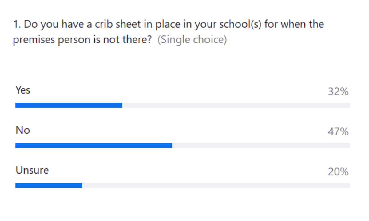 A crib sheet is essentially a school information plan (foolproof guide, ABC schedule) - which has to be a completed, up-to-date and lists a rundown of everything that your member of premises staff needs to know in a day. It should be detailed and include everything from contact numbers to alarm codes, key handovers, gate timings, contractor details, etc, etc. For example, if they’re opening up and have cleaning staff arriving, they’ll need to know the name of the company to ensure security.